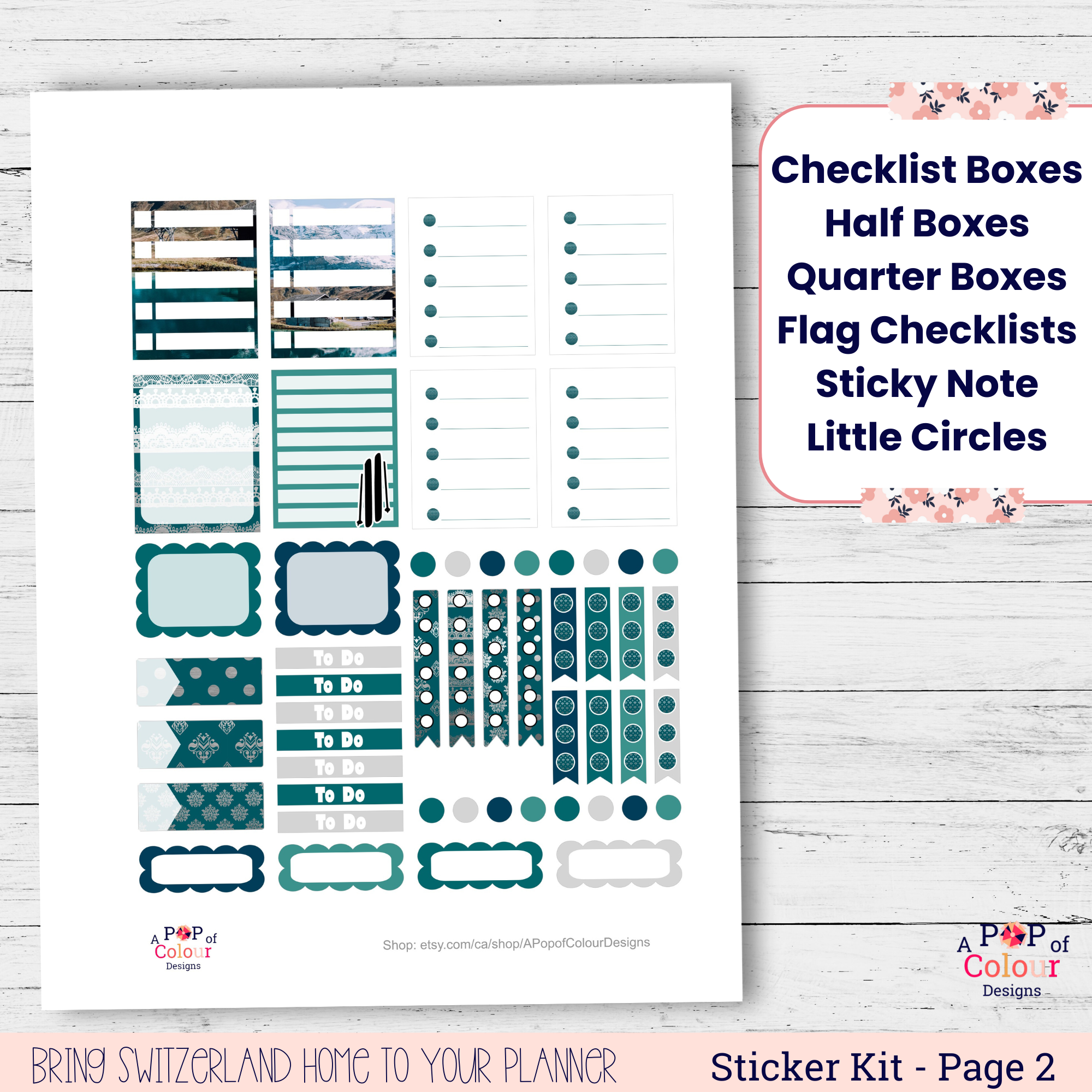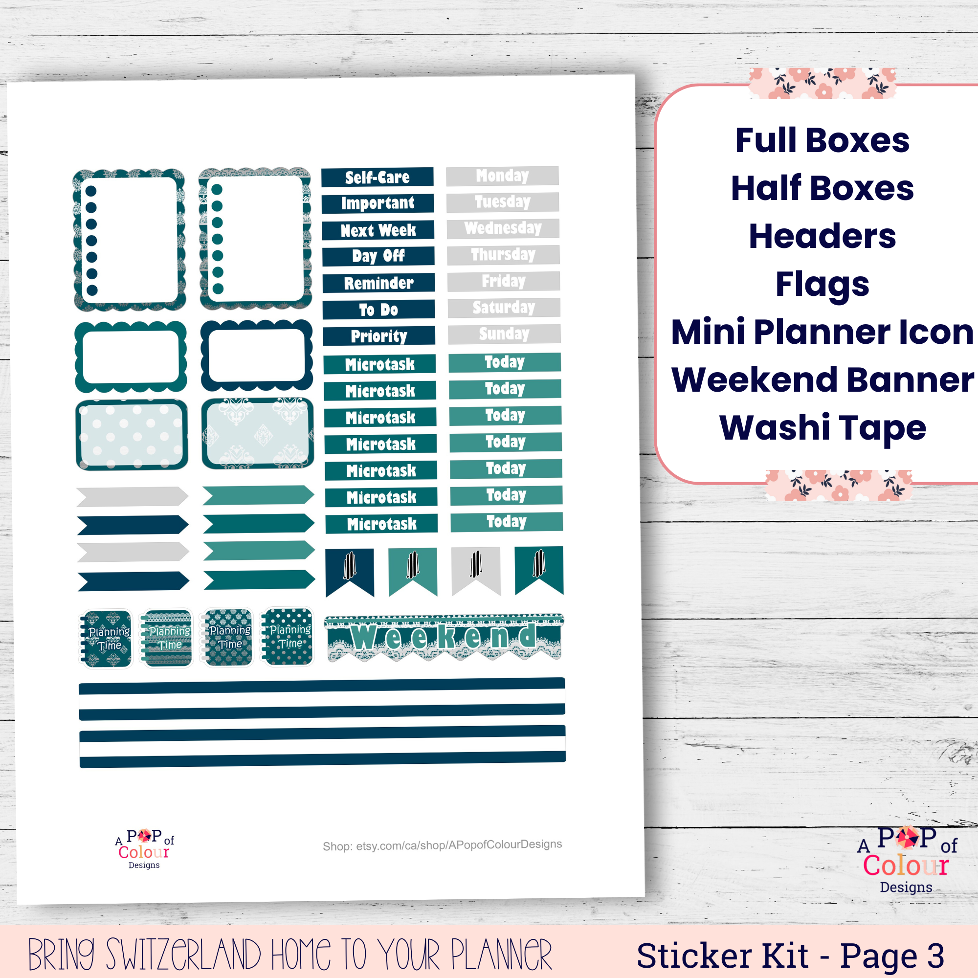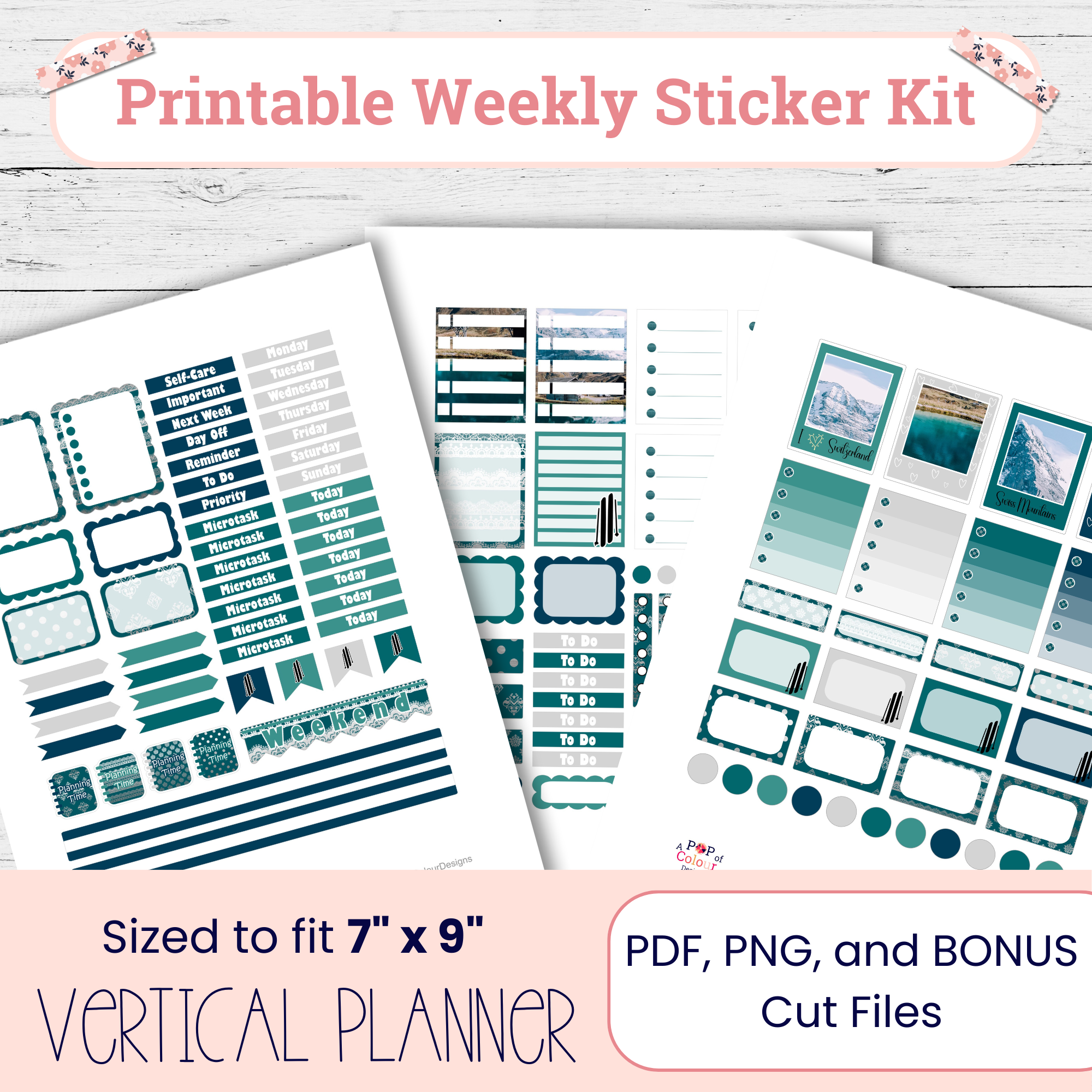 Alpine Teal is a winter-inspired weekly planner sticker kit featuring cool teal tones, structured boxes, and subtle ski graphics. Designed for vertical planners, this printable kit includes a mix of functional and decorative stickers to help you plan your week with clarity while adding a crisp, outdoorsy feel to your spreads.