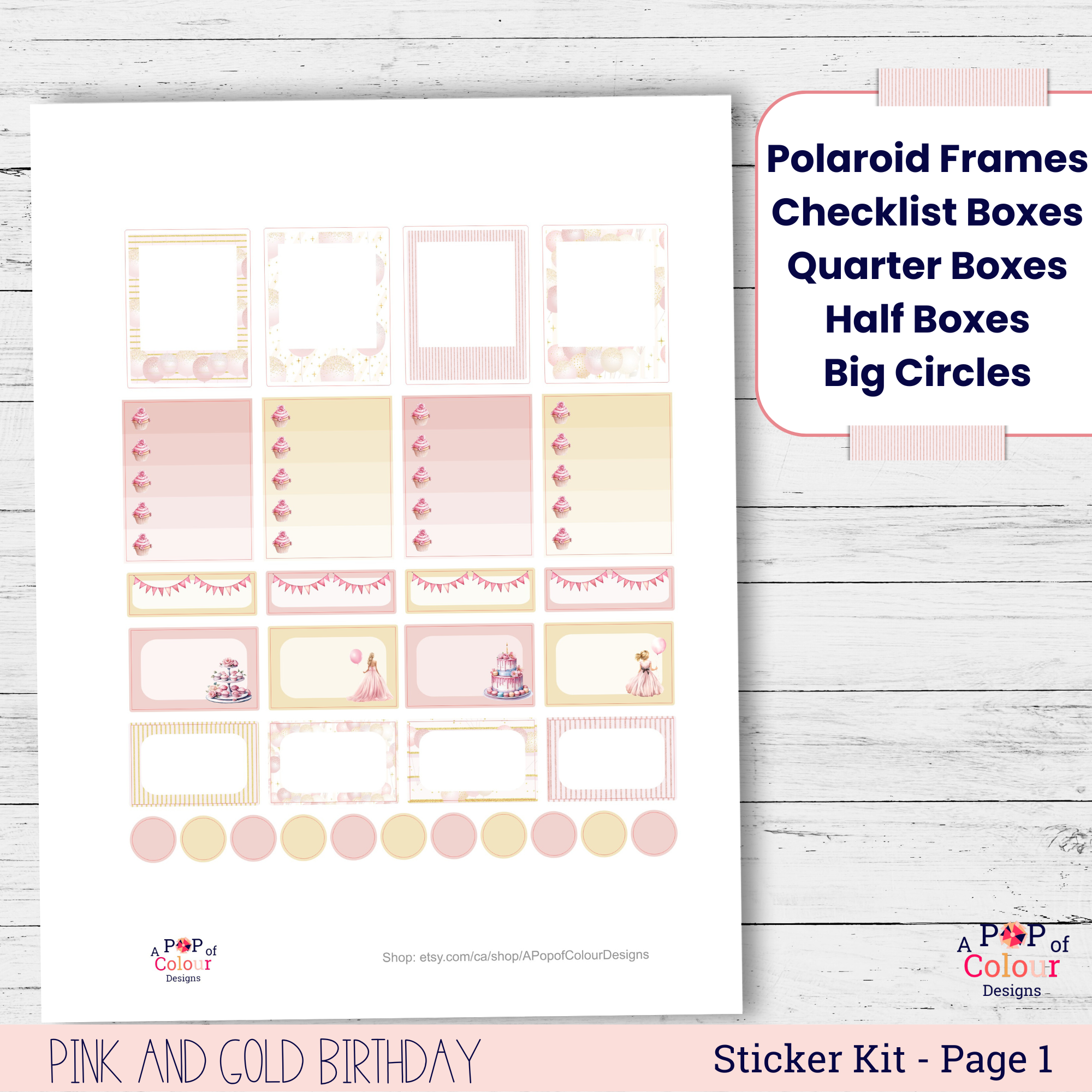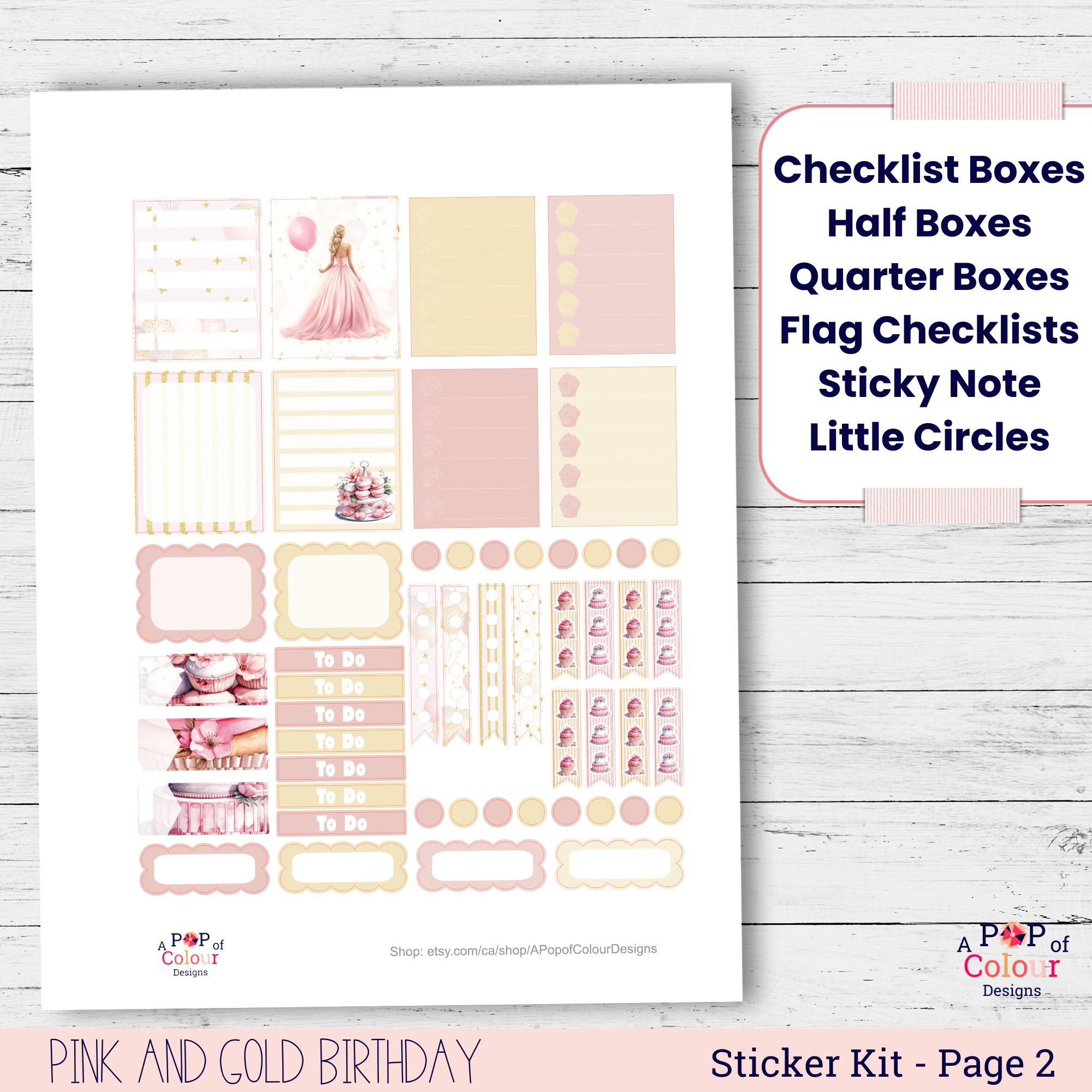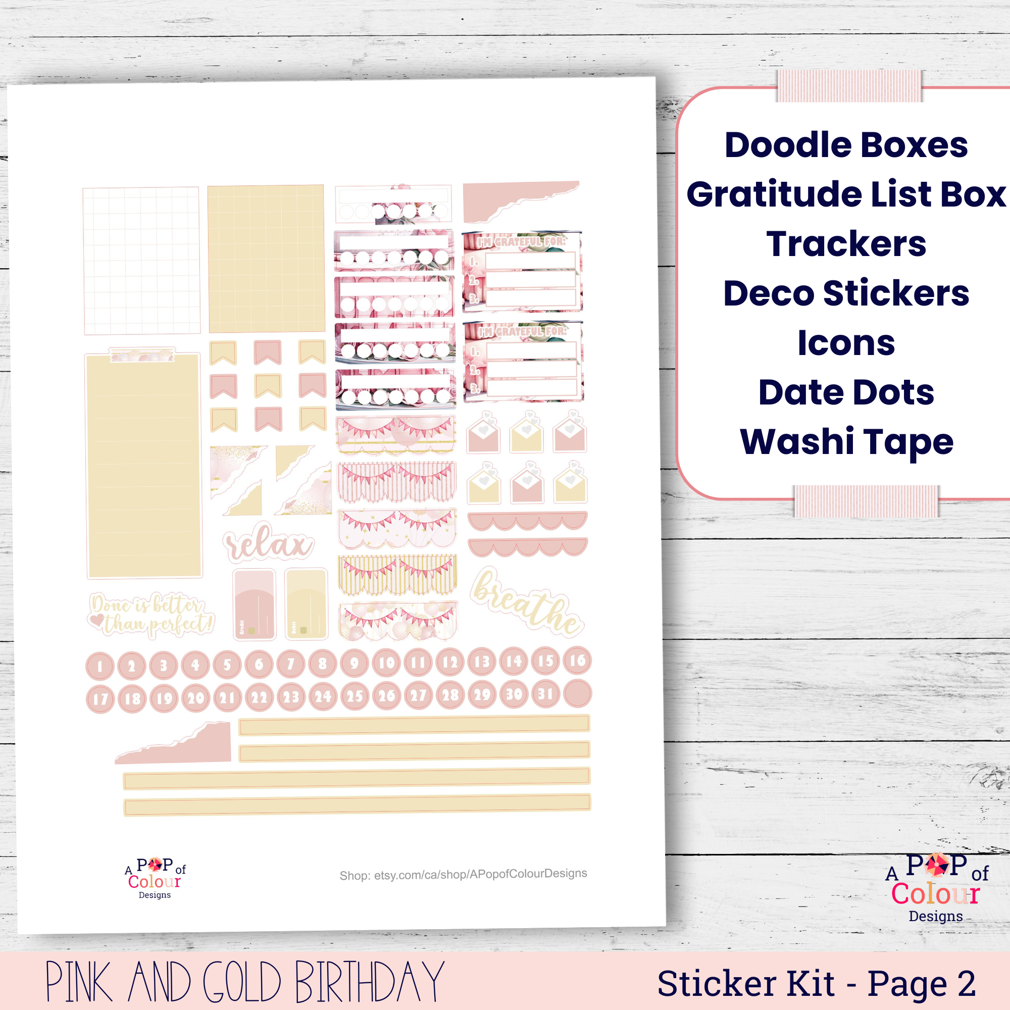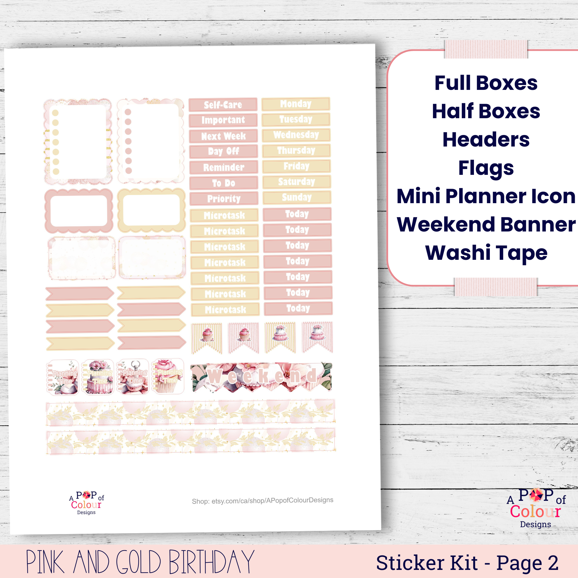 Make your birthday week feel extra special with this elegant Printable Birthday Planner Sticker Kit! Designed for creative like you who love adding a touch of glamour and fun to their planners, this 4-page kit brings the perfect blend of soft pinks, shimmering gold accents, and party-ready designs—think balloons, cakes, banners, and delicate details that make every spread feel like a celebration.