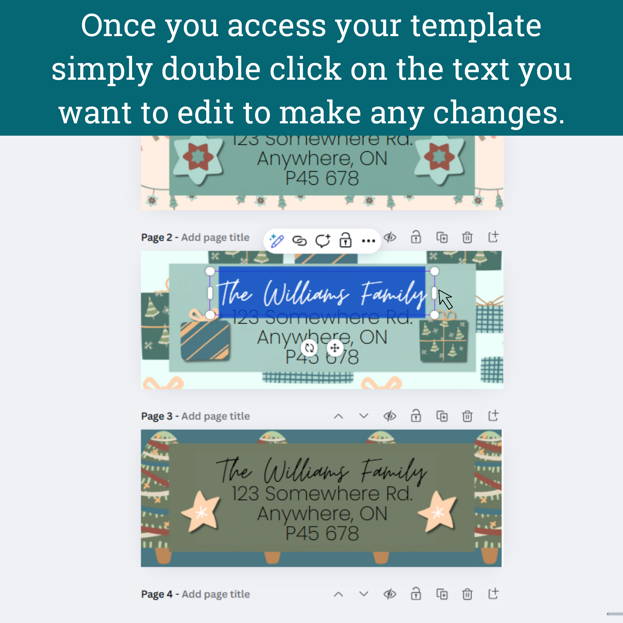 – PDF with edit and print instructions and your Canva template link (which will contain all 6 editable Christmas return address label designs).