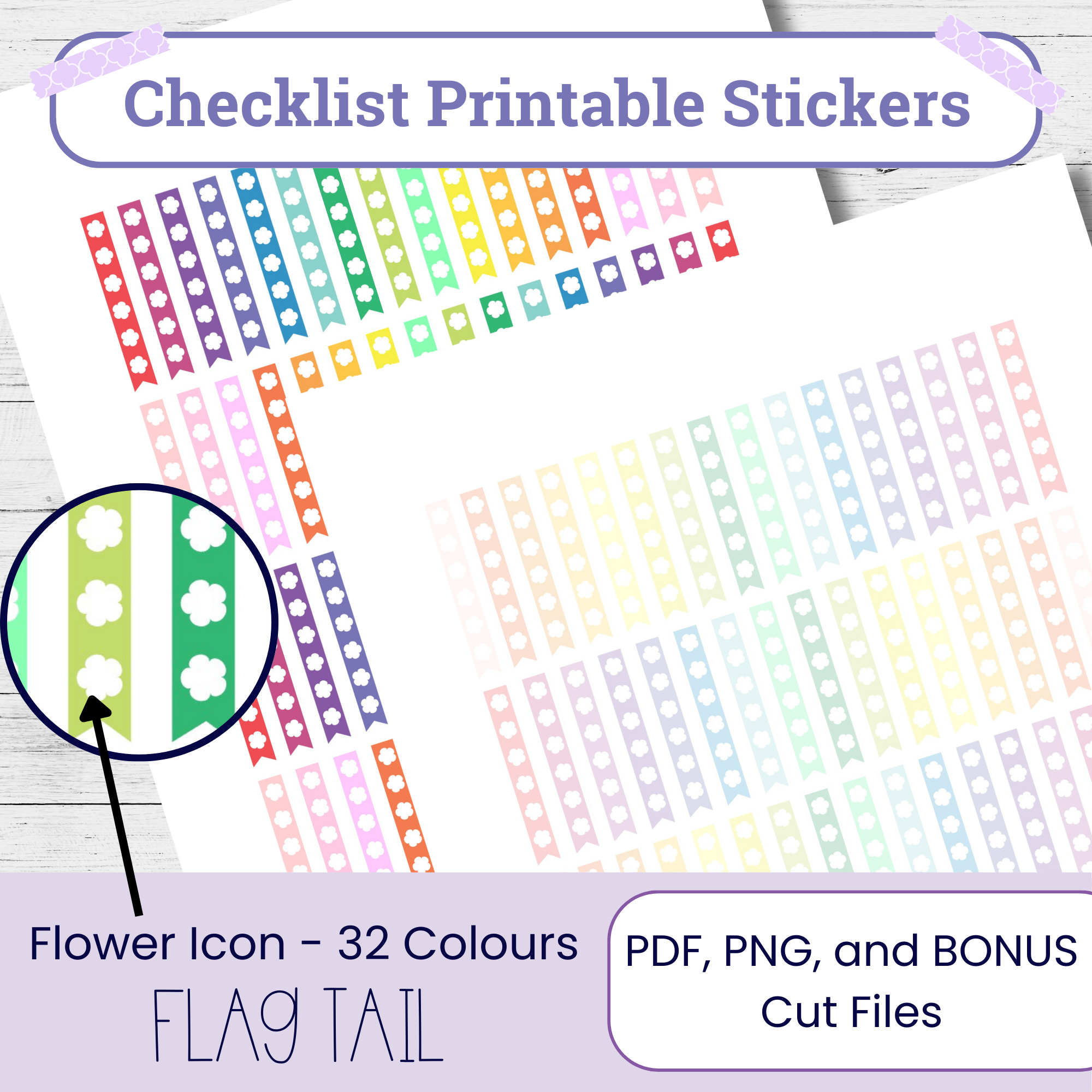 Flag-tailed checklist printable stickers in 32 colors! This checklist features a flower icon for the check boxes. Make planning more fun with these fun and colorful checklist stickers.
