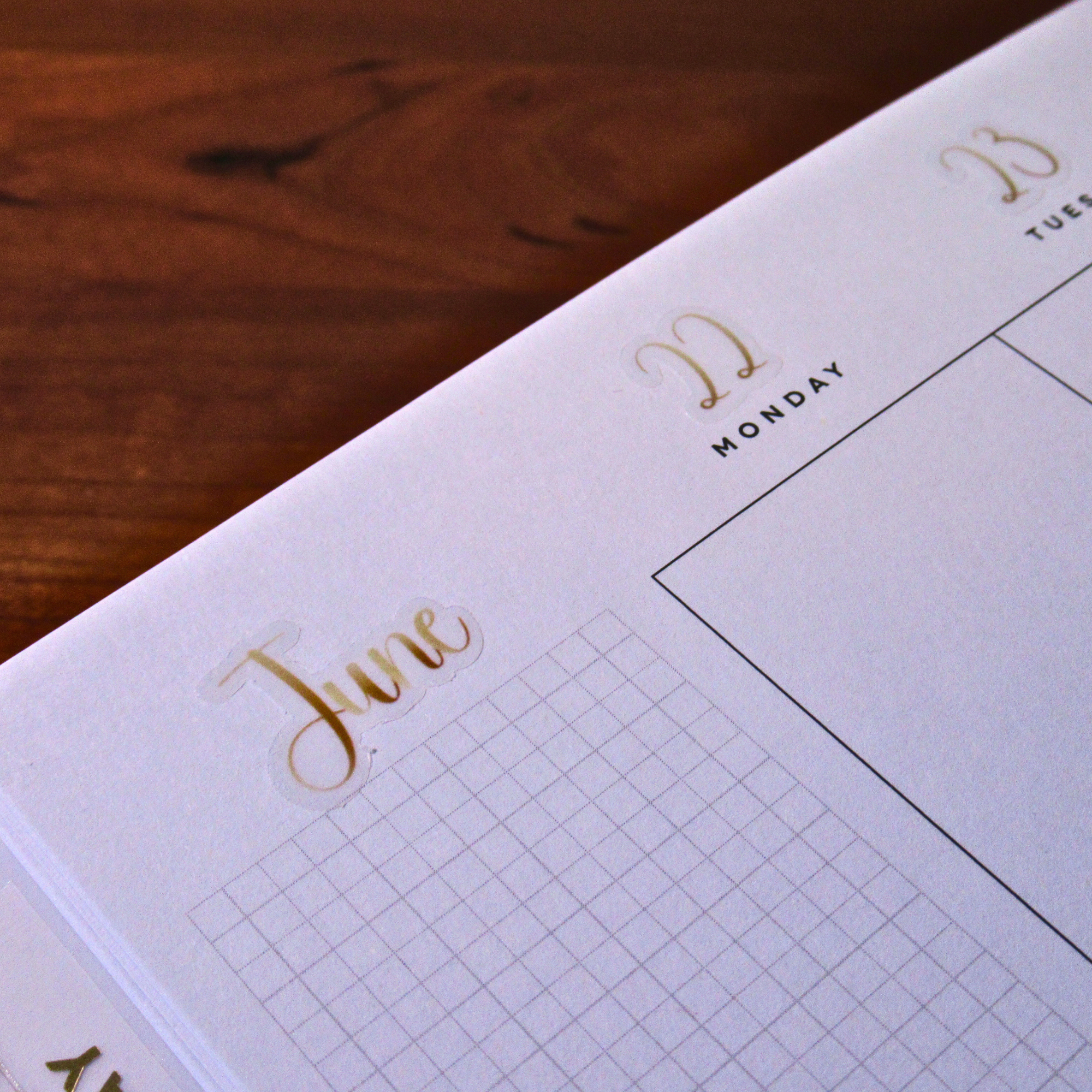 Add a polished, minimal touch to your planner with these gold month stickers. Designed for vertical layouts, this printable sheet helps you create clean, cohesive weekly and monthly spreads in seconds. Simply print, cut, and label your layouts with ease.