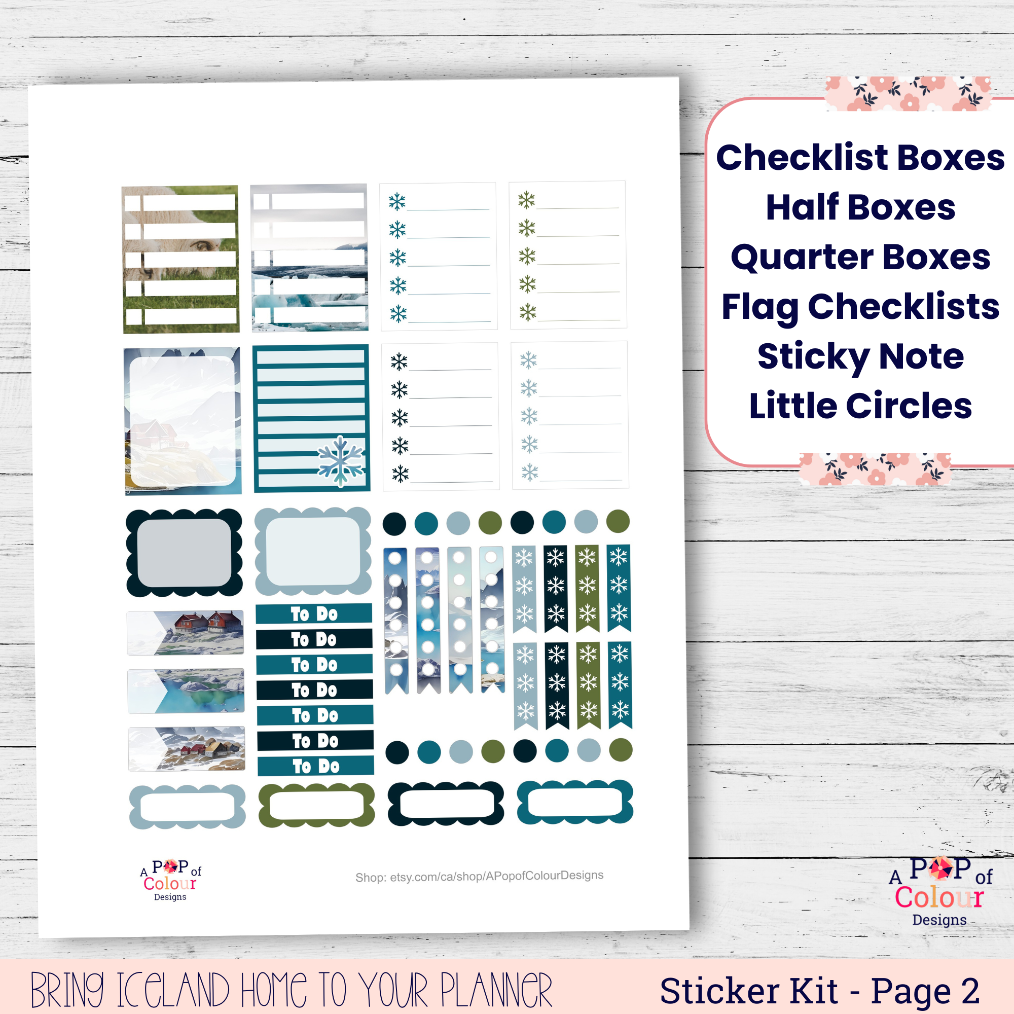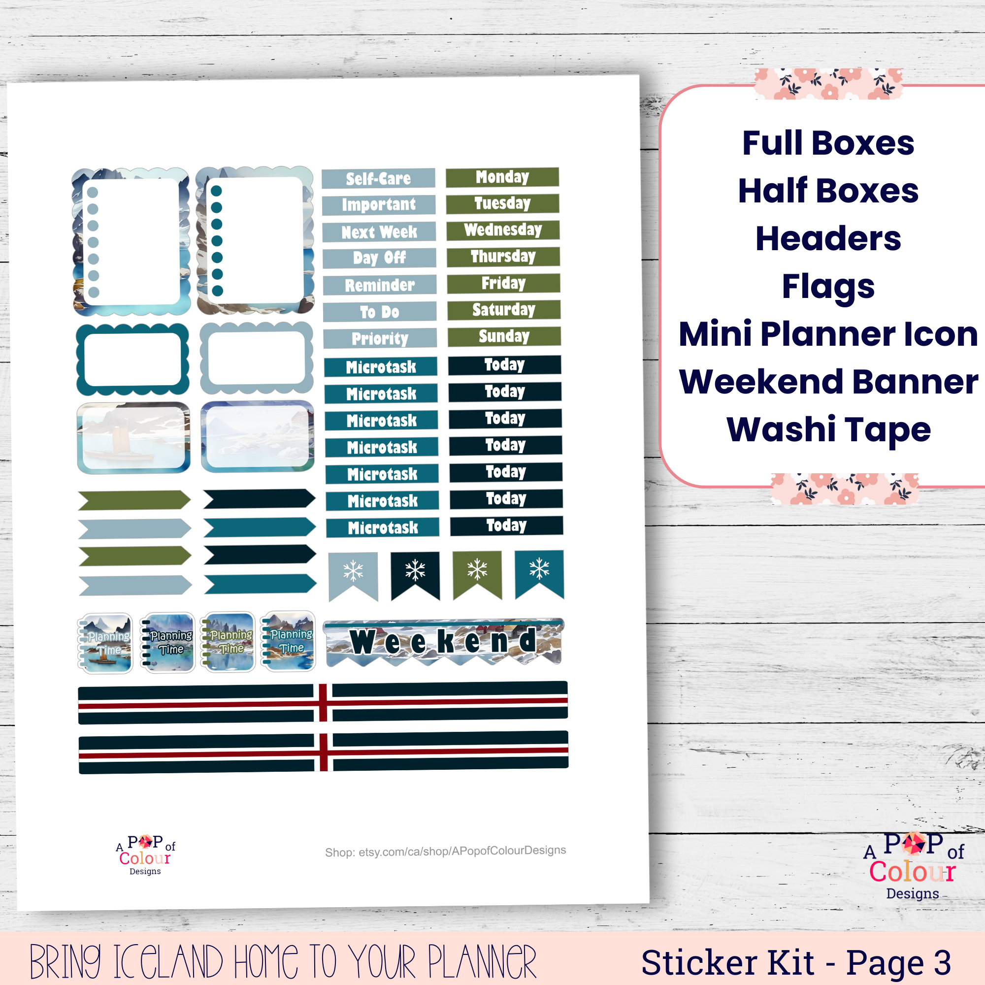 Escape to Iceland right from your desk with this charming printable planner sticker kit. Featuring travel-inspired designs, this 3-page printable set helps creative babes like you stay organized while adding a burst of color and personality to your week.