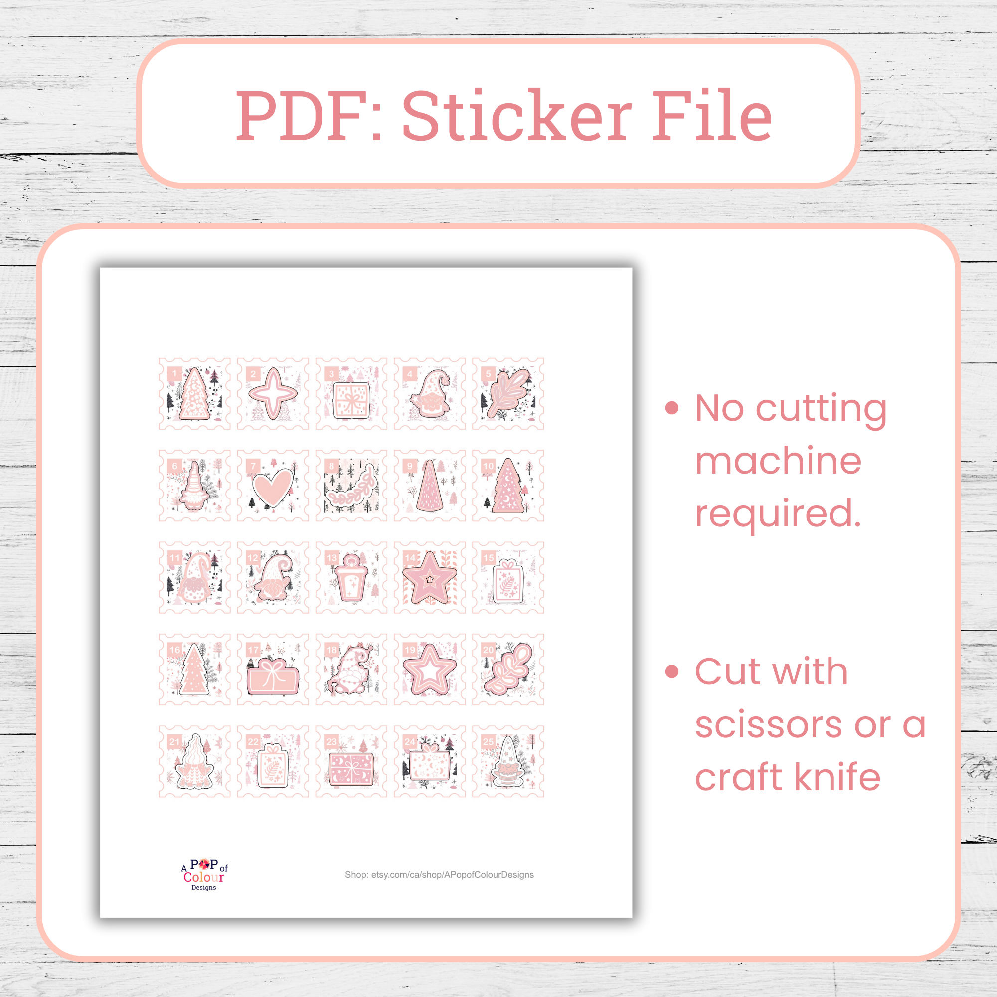 – Advent Countdown Stickers: 1 PNG file with transparent background (for Cricut and Silhouette users) & 1 PDF (for cutting by hand)