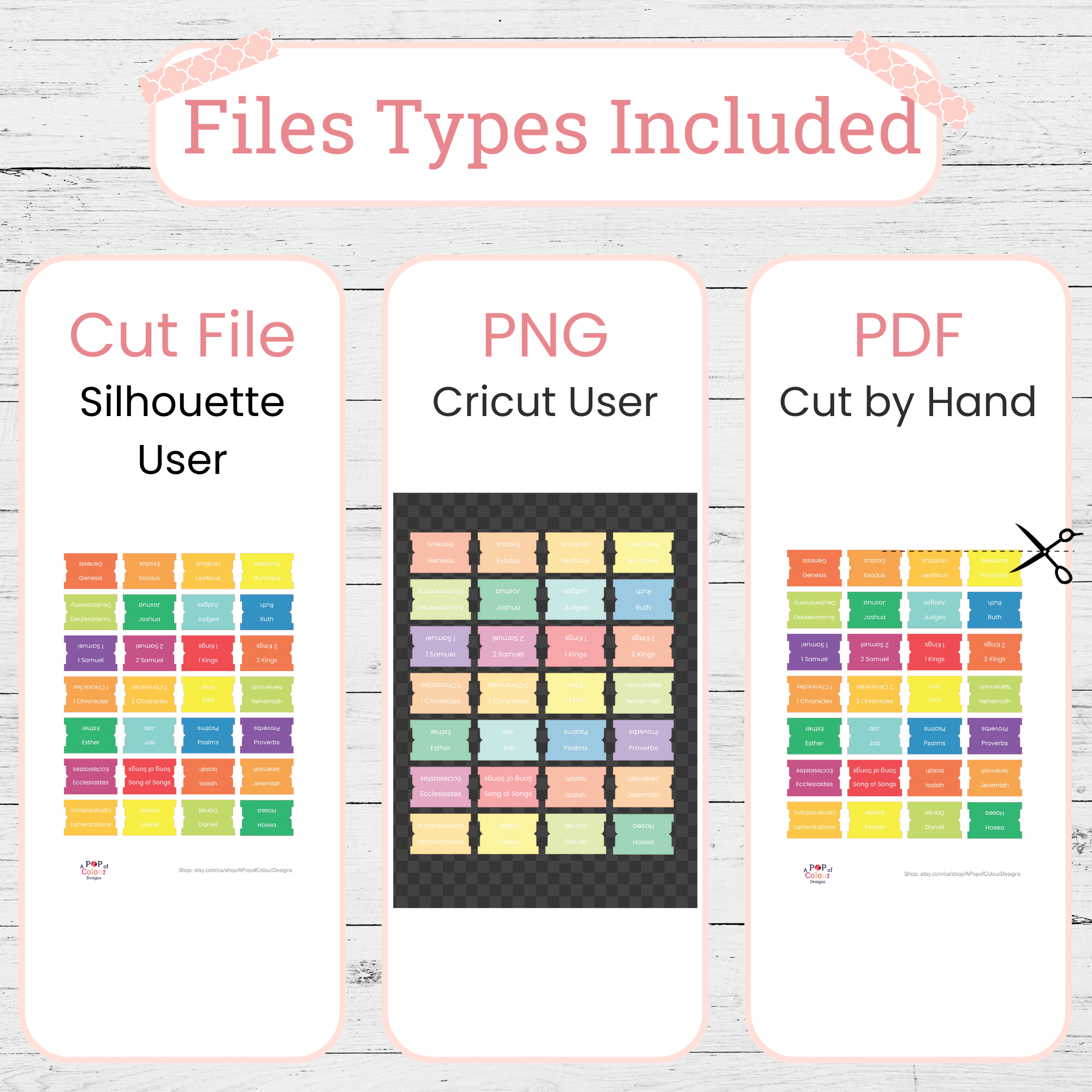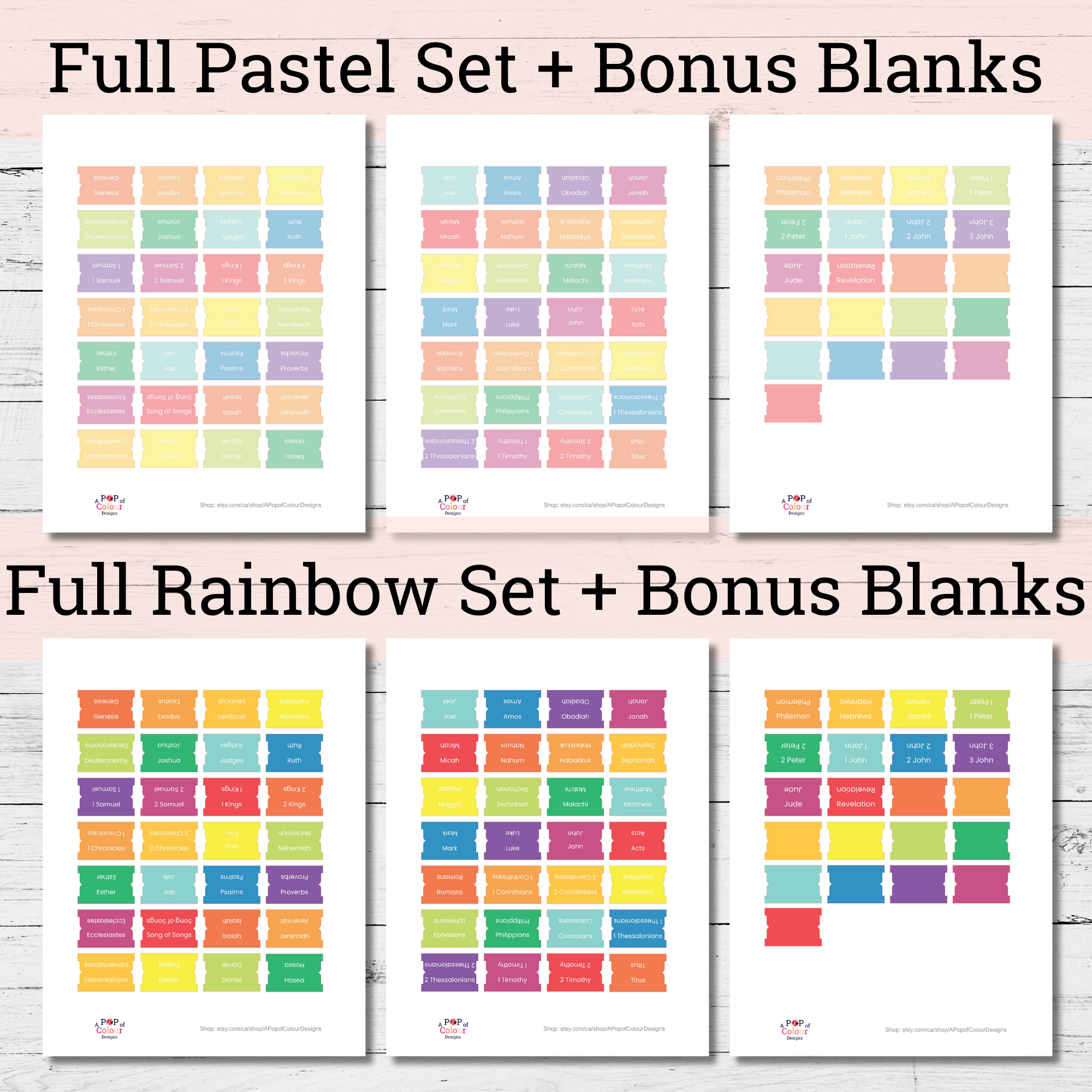 Organize your Bible with joy and color using these printable Bible tabs featuring all 66 books of the Bible in two creative styles: a bright rainbow set and a soft pastel set.