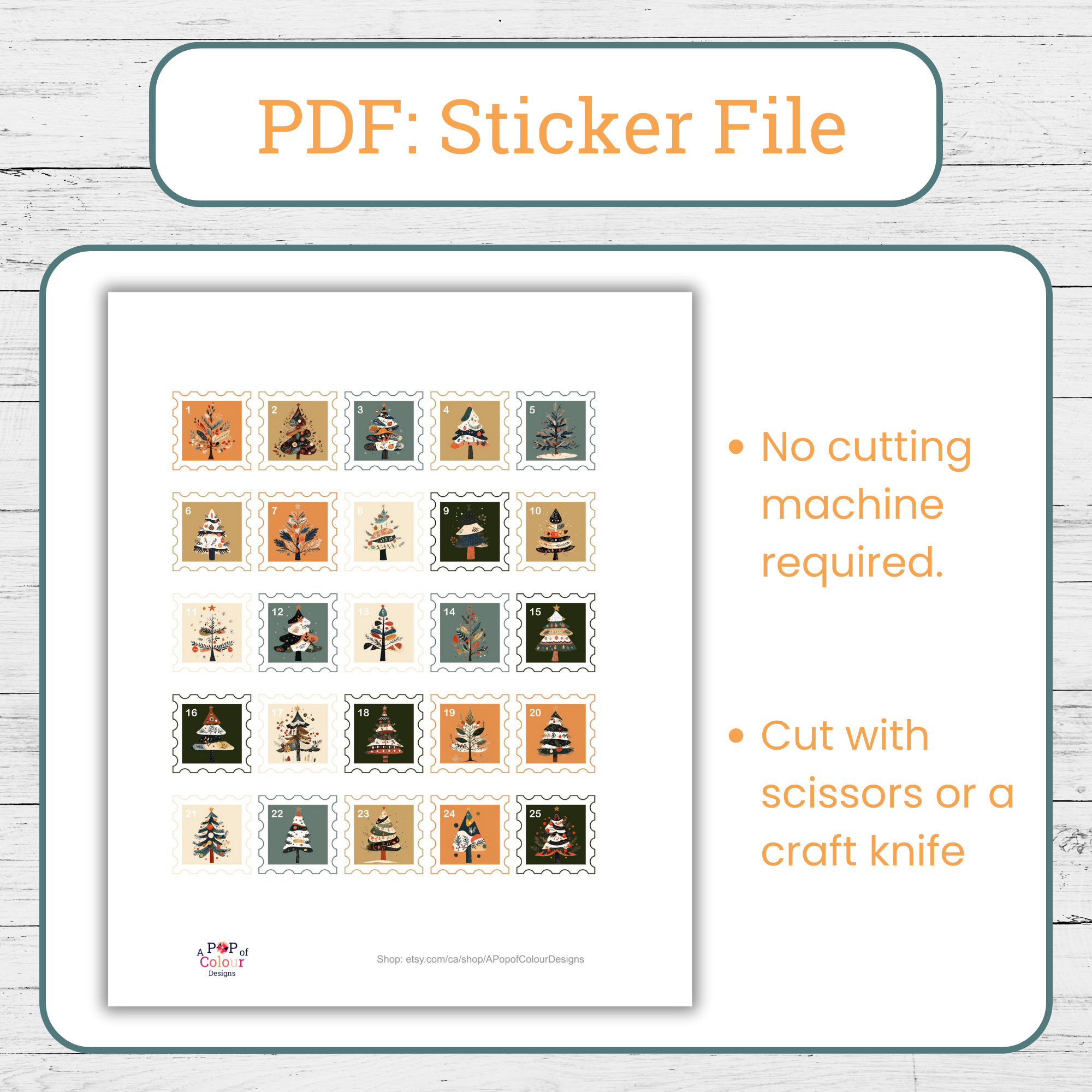 – Advent Countdown Stickers: 1 PNG file with transparent background (for Cricut and Silhouette users) & 1 PDF (for cutting by hand)