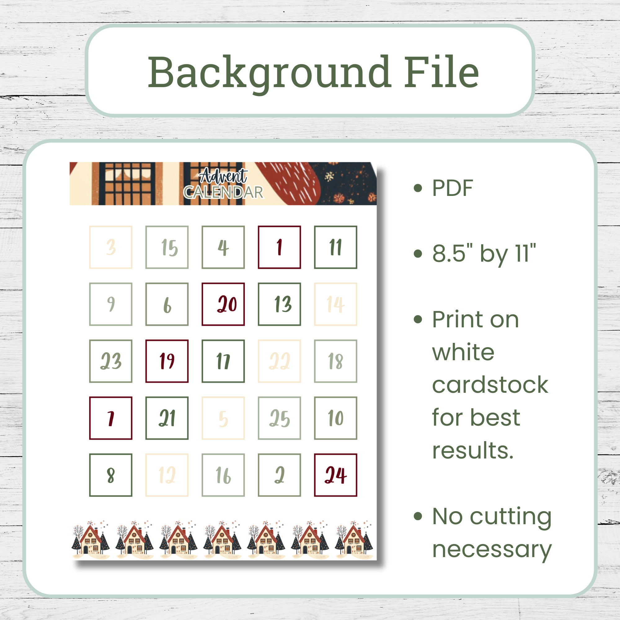 – 1 PDF with a winter house-themed advent calendar background