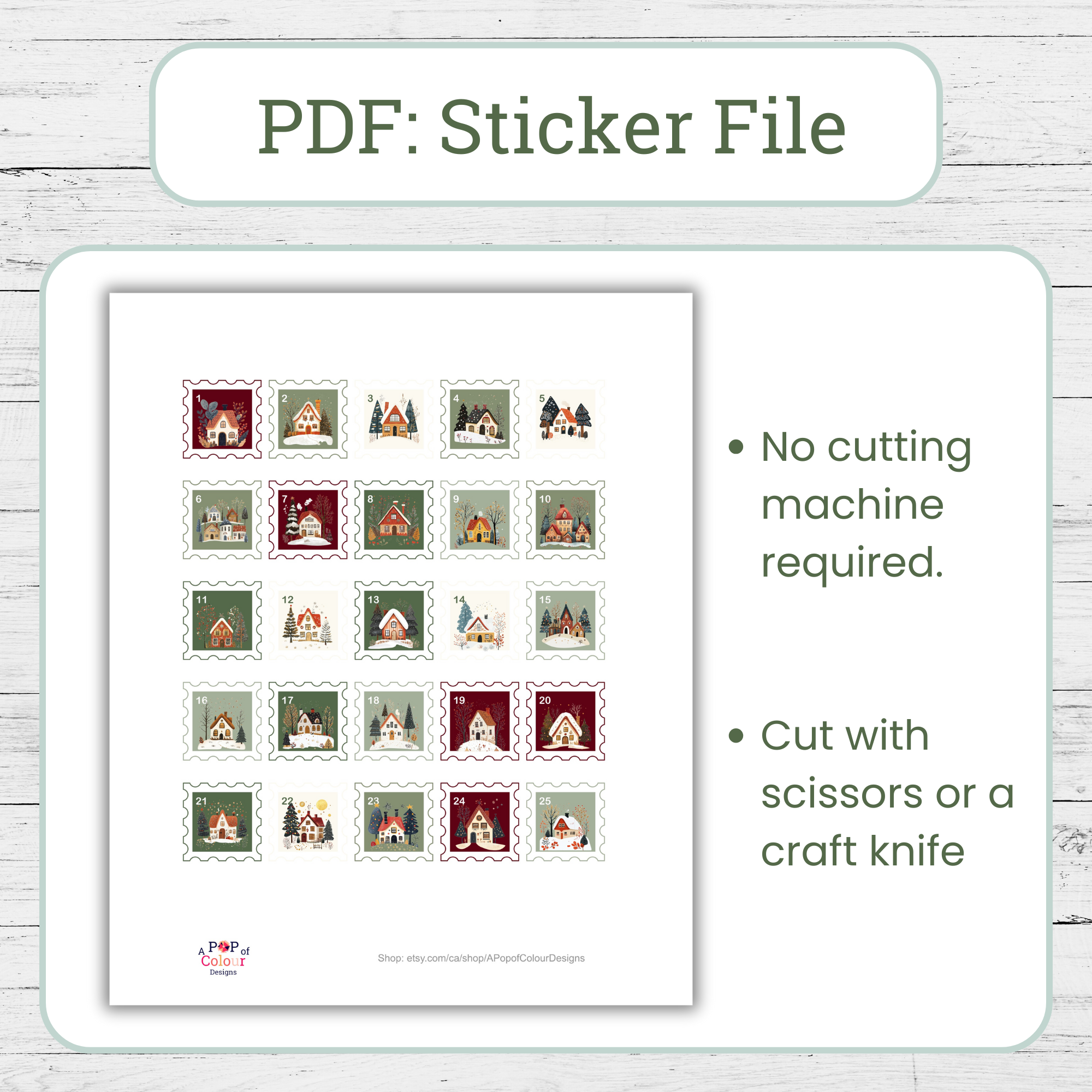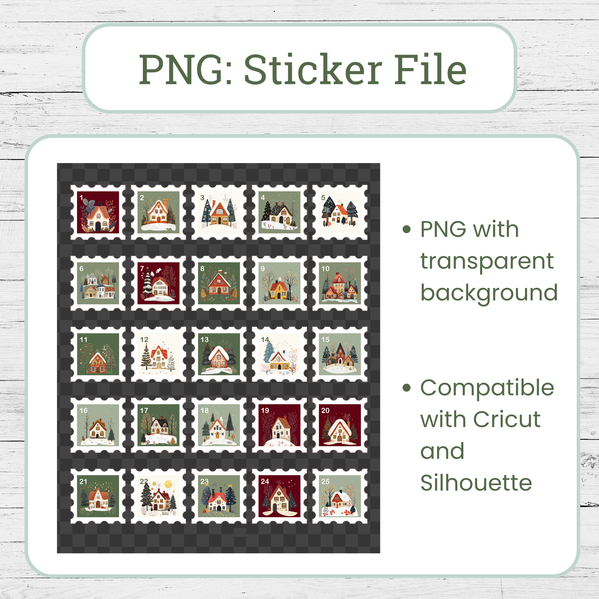 – Advent Countdown Stickers: 1 PNG file with transparent background (for Cricut and Silhouette users) & 1 PDF (for cutting by hand)