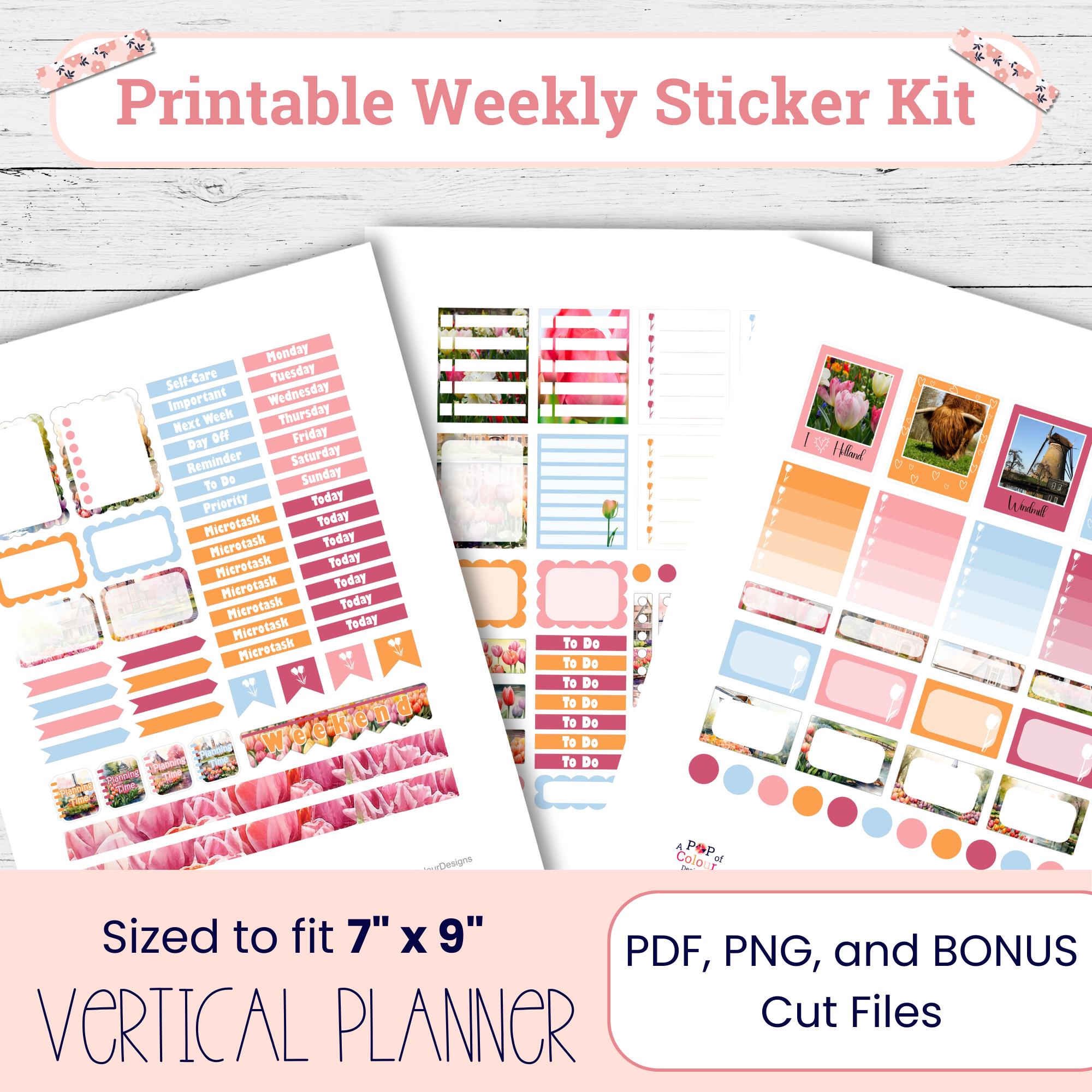 Spring Florals brings gentle florals and cheerful spring colors to your weekly planning. This printable weekly planner sticker kit is designed for vertical planners and includes structured boxes, labels, and decorative stickers that keep your layout organized while adding a light, seasonal feel.