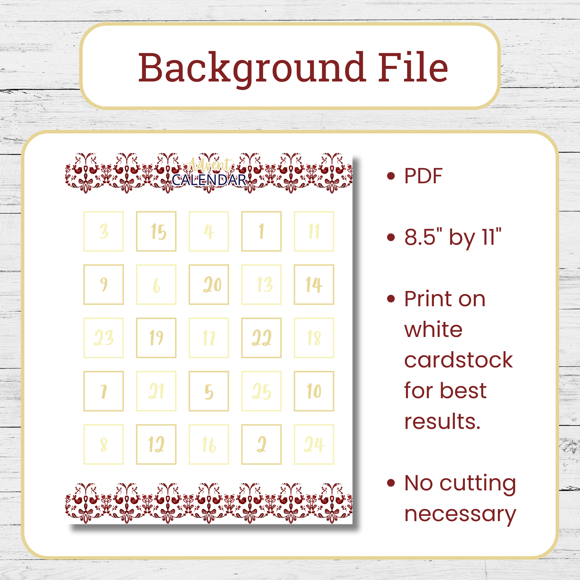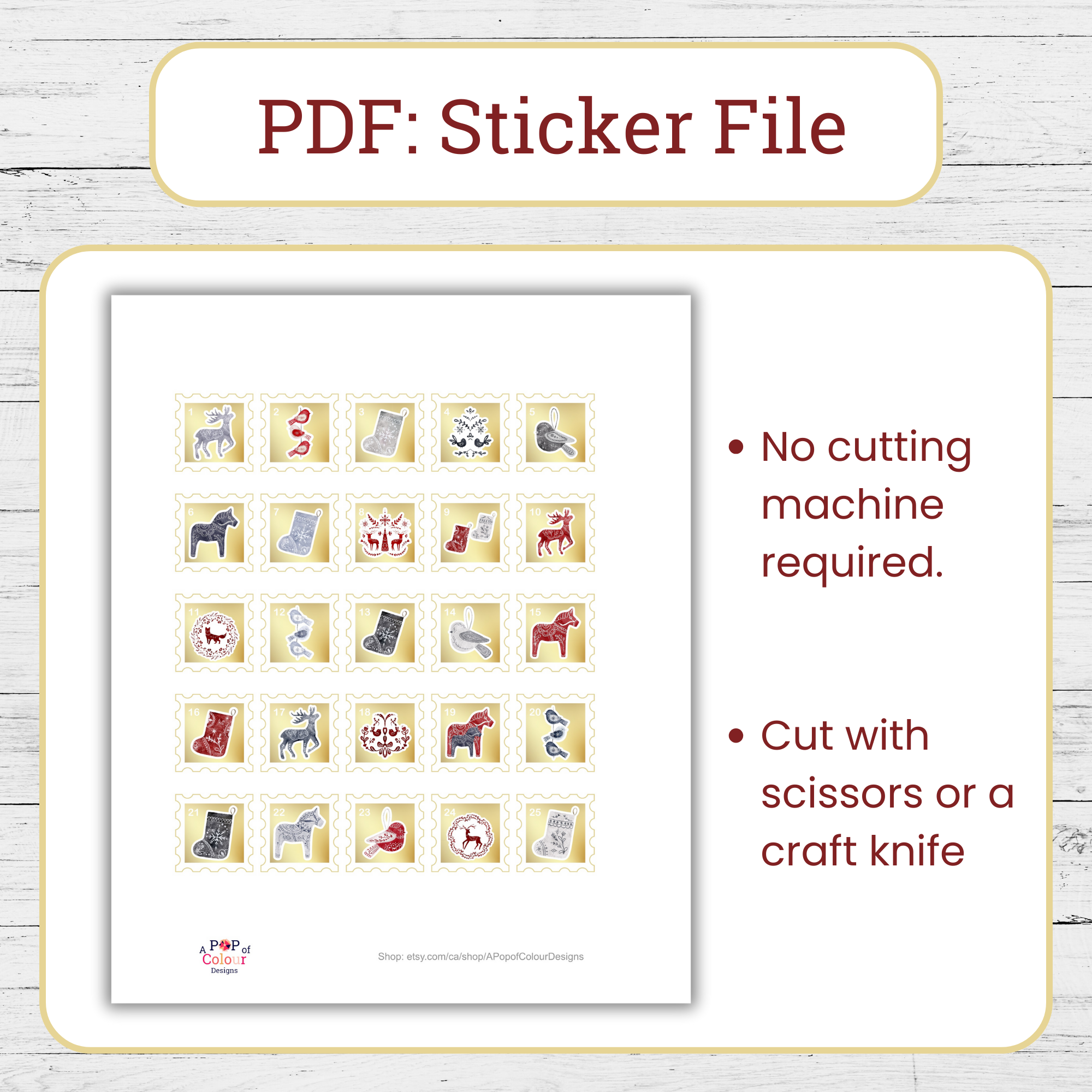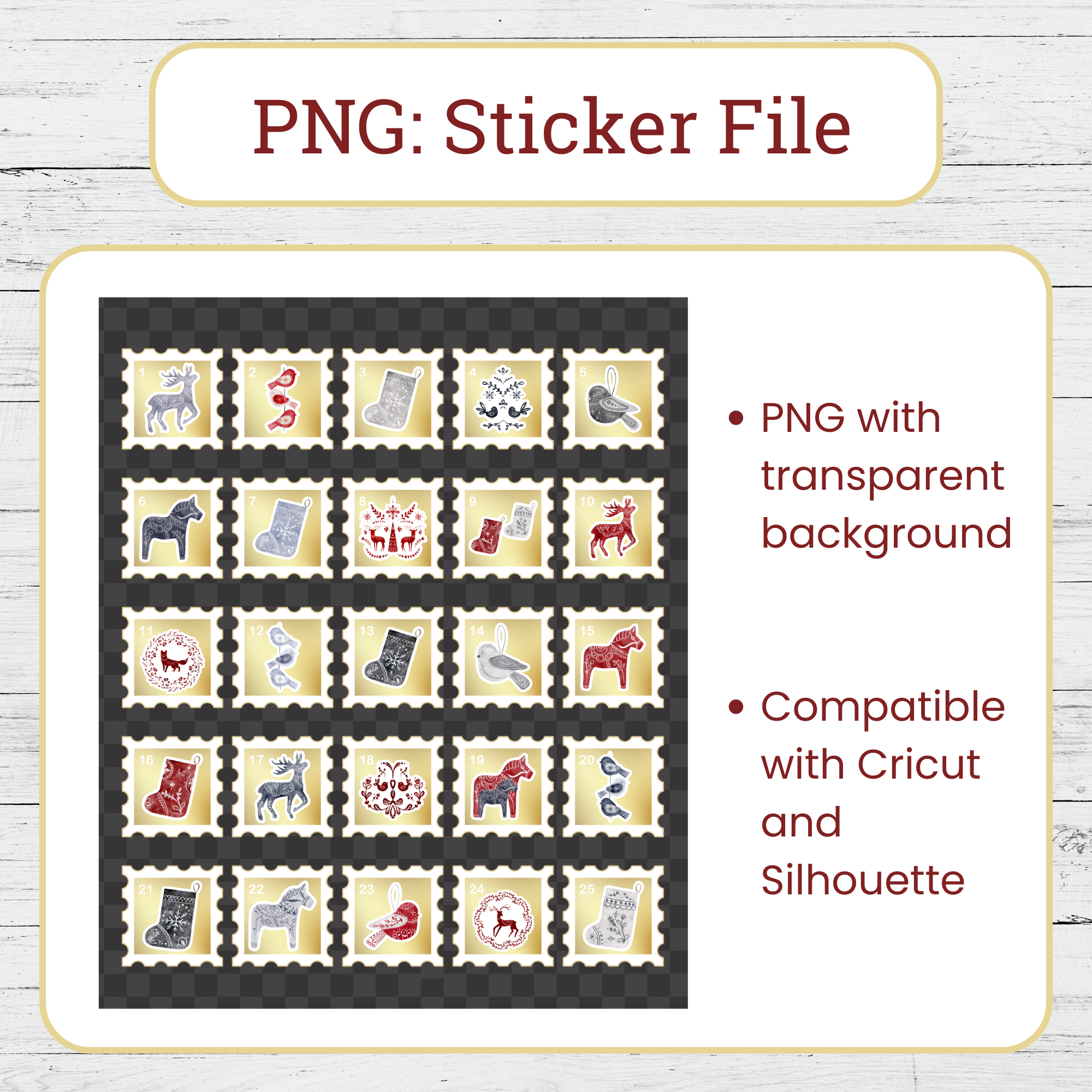 – Advent Countdown Stickers: 1 PNG file with transparent background (for Cricut and Silhouette users) & 1 PDF (for cutting by hand)