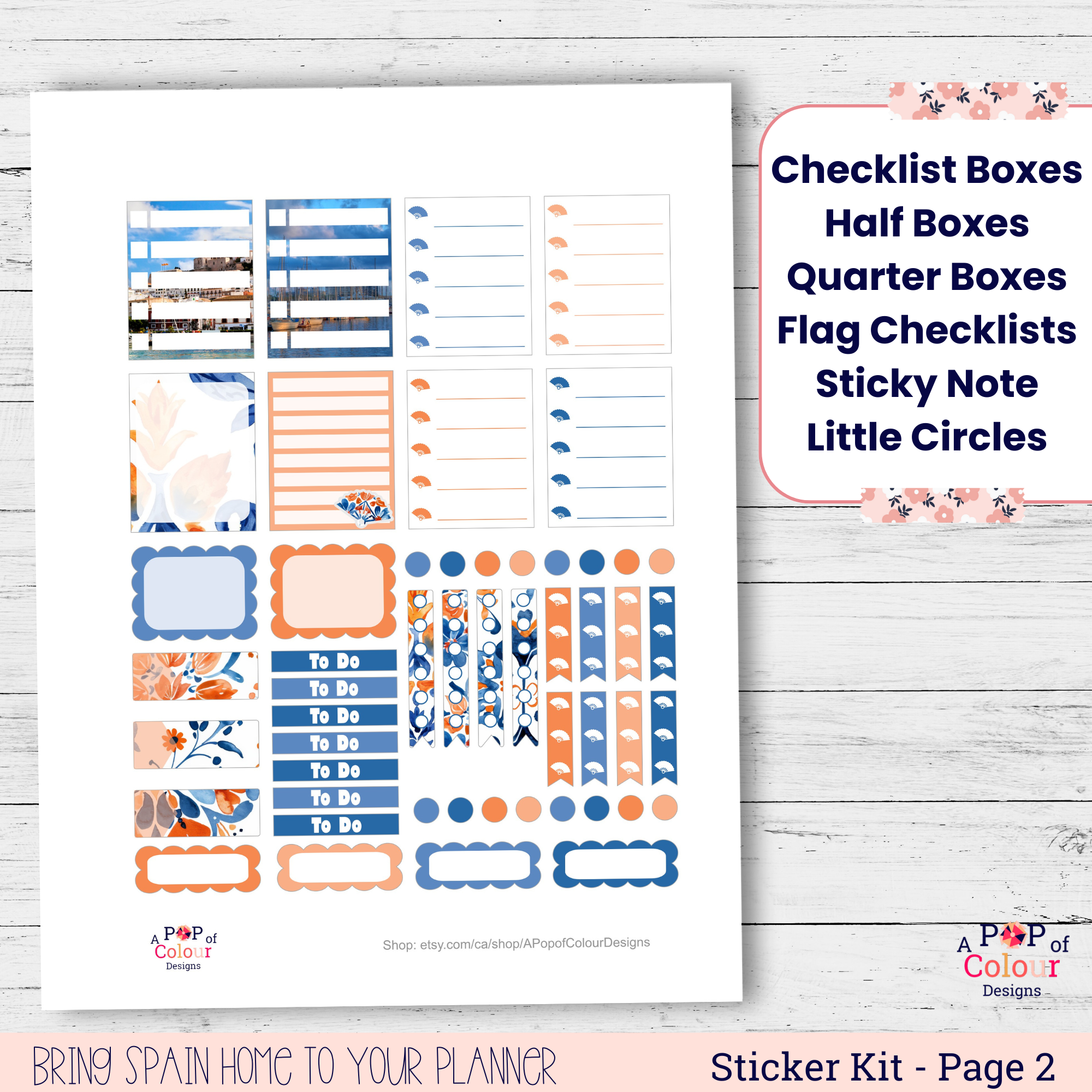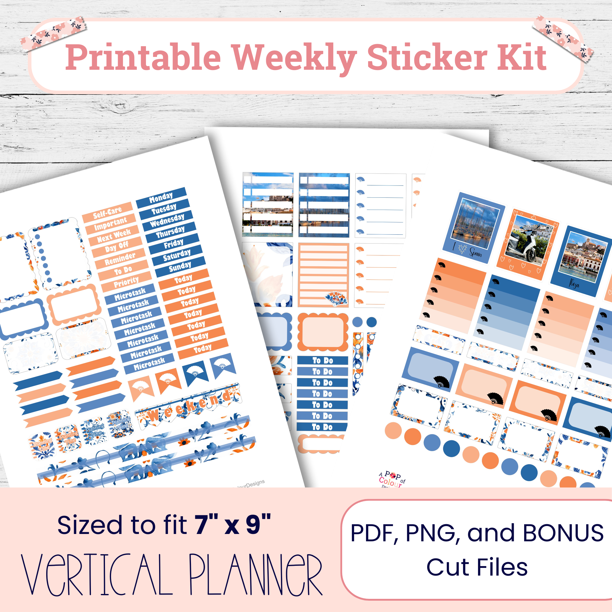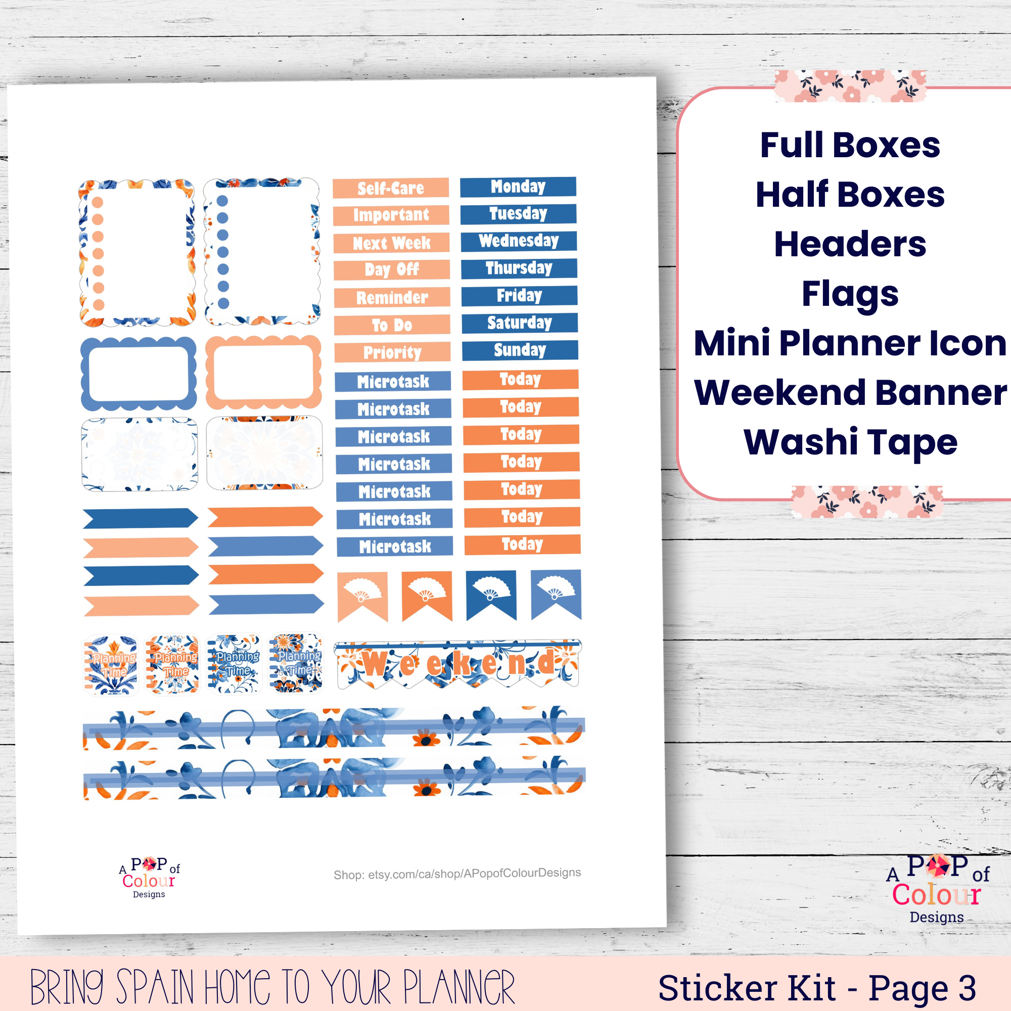 Terracotta & Blue is a printable weekly planner sticker kit featuring scenic full boxes and a bold, coordinated terracotta and blue color palette. Designed for vertical planners, this kit includes structured boxes, labels, and functional stickers that bring a warm, expressive look to your weekly planning while keeping everything clear and easy to use.