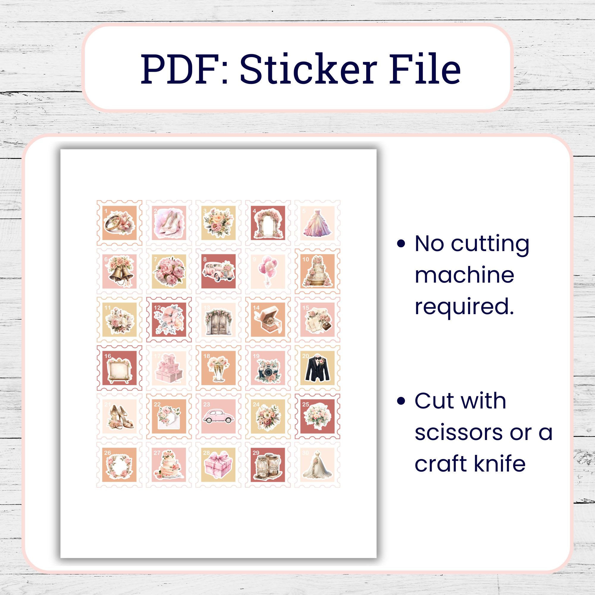 ✨ 1 wedding countdown stickers sheet (8.5″x11″). Each sticker is 1.2″ by 1.2″.