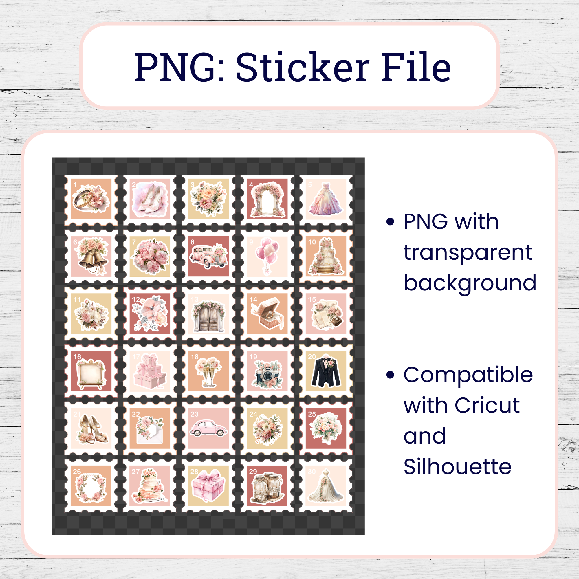 Do your 30-day wedding countdown in style! Simply peel and stick the countdown reminders directly into your planner, or use the lovely calendar background provided to showcase your excitement. You can use the stickers directly in your planner, or you can use the calendar background provided.